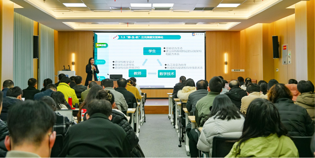 互动环节,教师们围绕“人机协同教学设计”“数据驱动过程评价”“跨学科思政案例开发”等议题踊跃提问,曹教授结合自身教学创新实践逐一详尽解答。现场交流深入,研讨氛围热烈。
