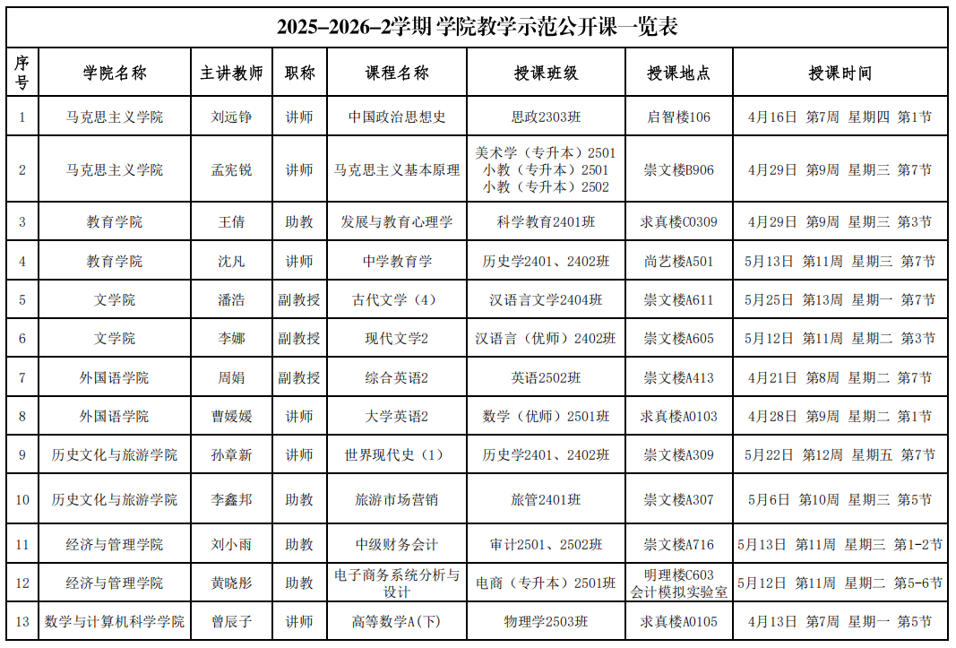 根据学校工作安排,在各学院积极支持与配合下,本学期教学示范公开课活动已经启动,现将二级学院教学示范公开课推荐情况公布如下。请各二级学院认真组织好相关教学示范活动,并鼓励教师跨学院、跨学科观摩交流,共同提升教学能力。